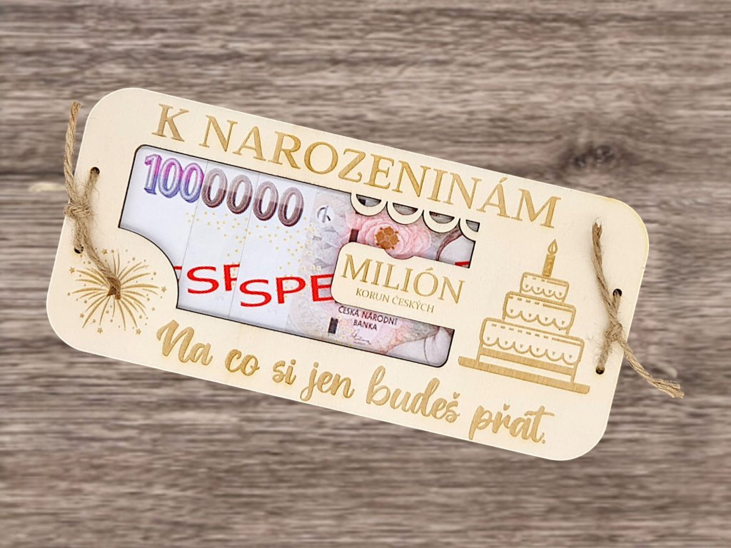 Vyrobená z kvalitní překližky, naše karta je nejen esteticky působivá, ale také ekologická. Ať už je to pro kolegu, přítele nebo člena rodiny, gravírovaný nápis „K narozeninám“ a motiv dortu dodají dárku tu pravou sváteční atmosféru. A teď si představte výraz na tváři obdarovaného, když uvidí, jak se před jeho očima z peněz skládá iluze milionu!