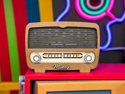 Popisovatelná dřevěná pokladnička ve stylu starého rádia s mazací vrstvou. Naspoř si 10 000,-