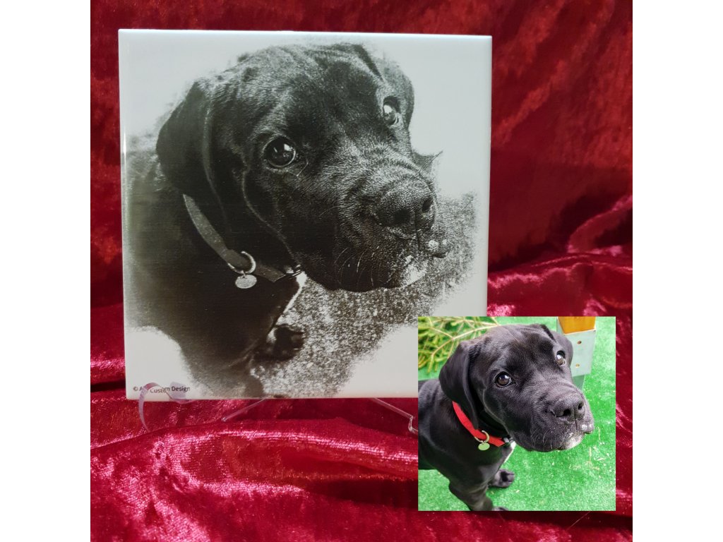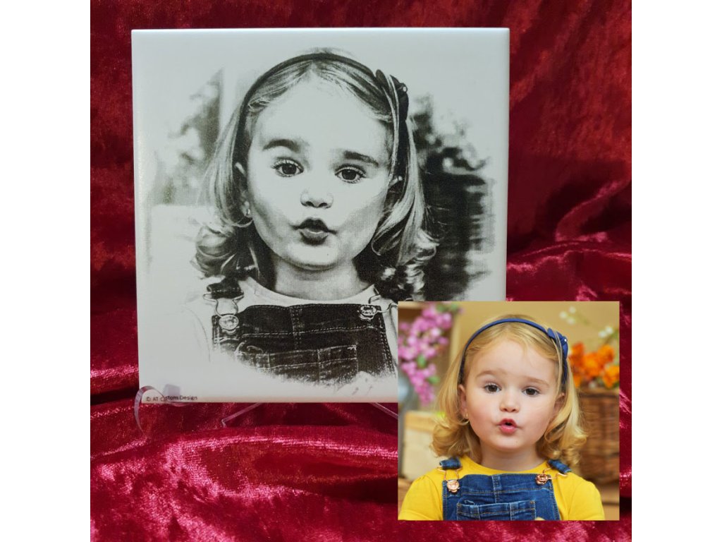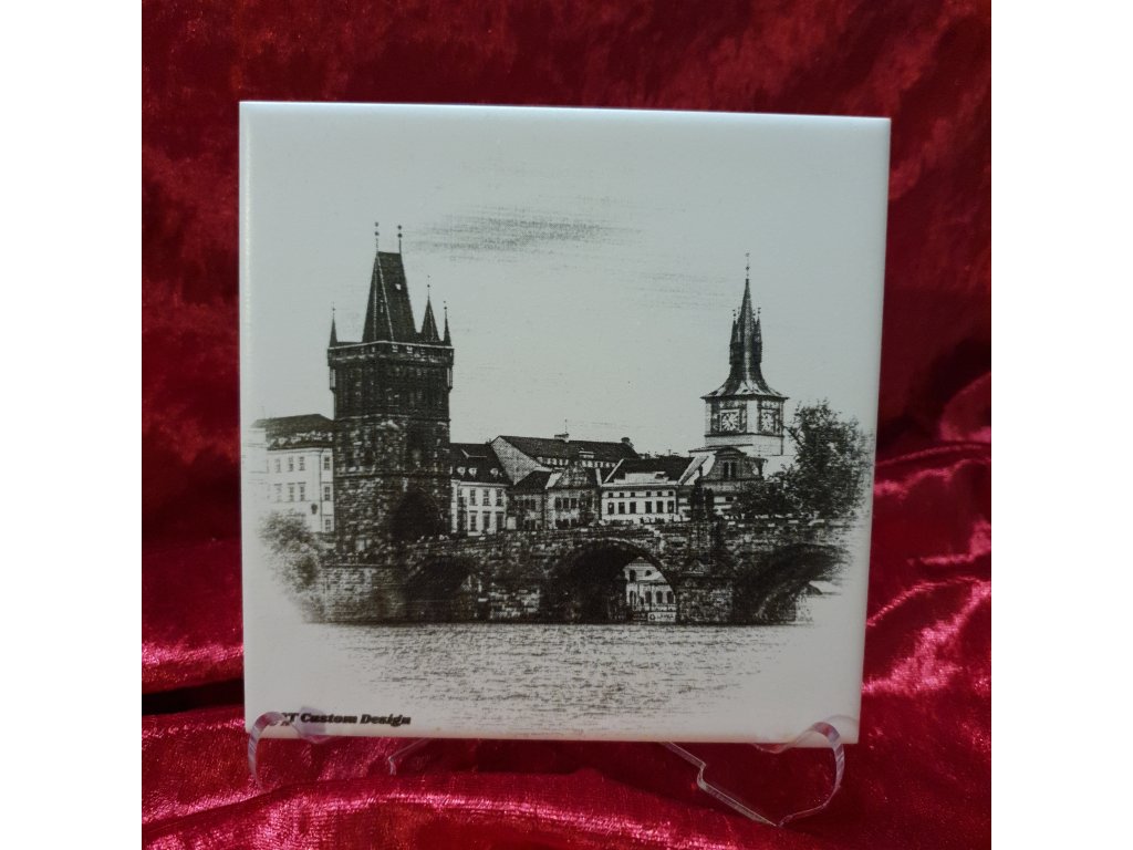 Originální zpracování dle tebou dodané fotografie. Fotografie je gravírována leserovým paprskem na připravený lesklý nebo matný bílý keramický obklad o rozměru 150x150mm. Reakcí laserového paprsku s povrchem vzniká odolná gravura která odolá i běžným rozpouštědlům a menším škrábancům. Dodáváno s praktickým stojánkem.