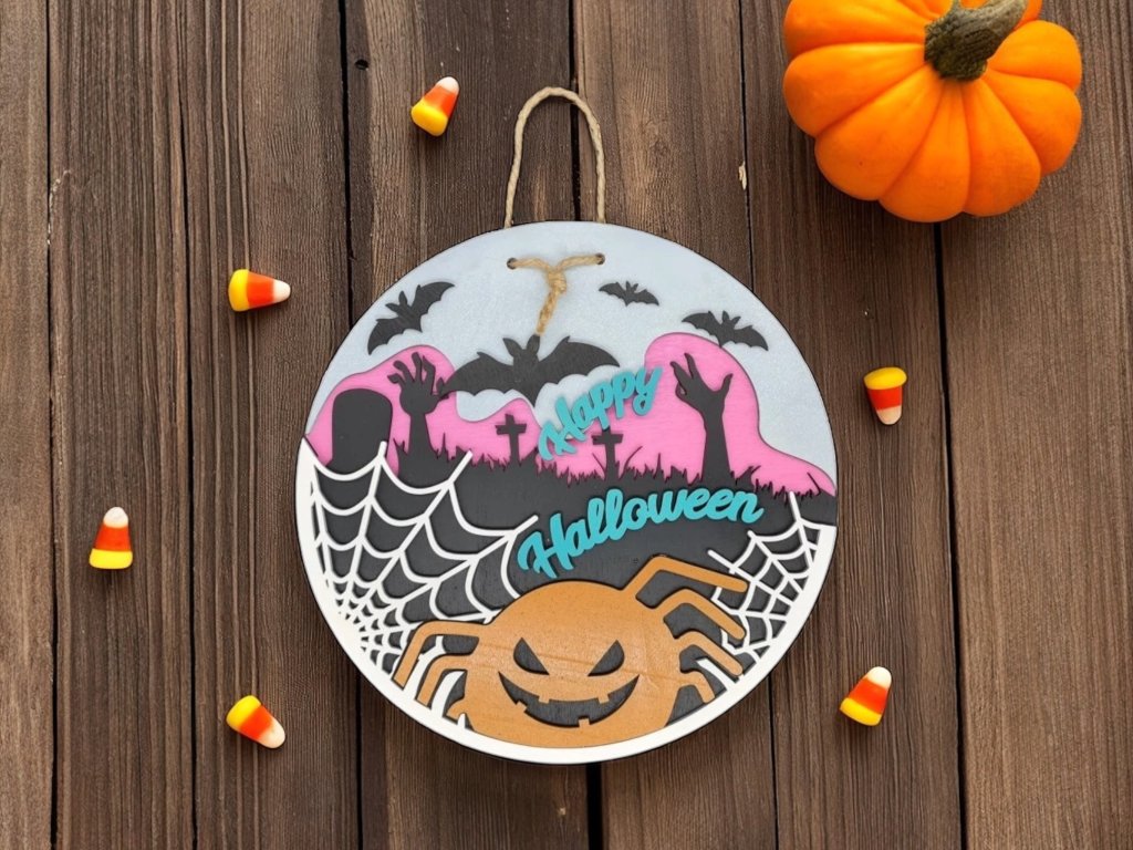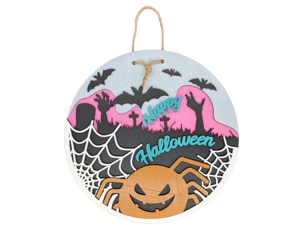 Máte rádi halloween my ano. Tahle barevná dekorace s pavoukem a zombie rukama spolehlivě ozdobí dveře nebo stěnu, doplní výzdobu a nadchne nejedno malé srdce.